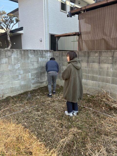 京都市西京区の現場にて、敷地の配置確認とお清めを行いました。