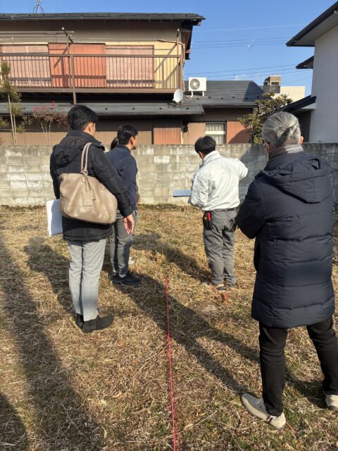 京都市西京区の現場にて、敷地の配置確認とお清めを行いました。