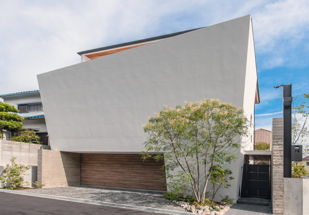 前面に傾いた壁がプライベートな寛ぎと上階の大空間をつくります。これは決して奇をてらっているわけではなく、通りからの視線を遮りながら、建物内部に開放感を生むための必然的なデザインになります。LDKに入ると大開口からの陽光が心地良い大空間が広がります。整ったライン、隅々の緻密な納まり、木やタイル、コンクリートなど素材の風合いが、無駄のないデザインの中でより際立ちます。